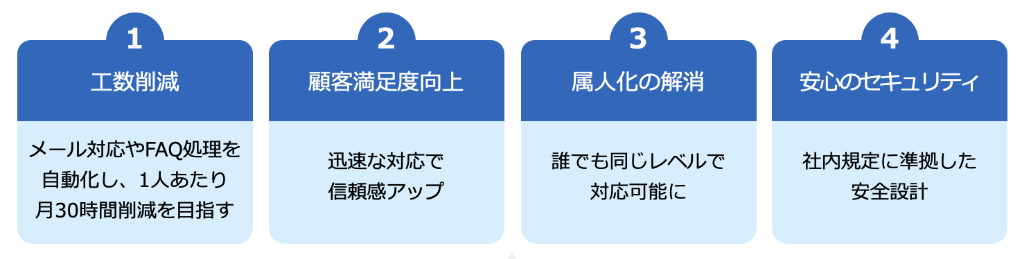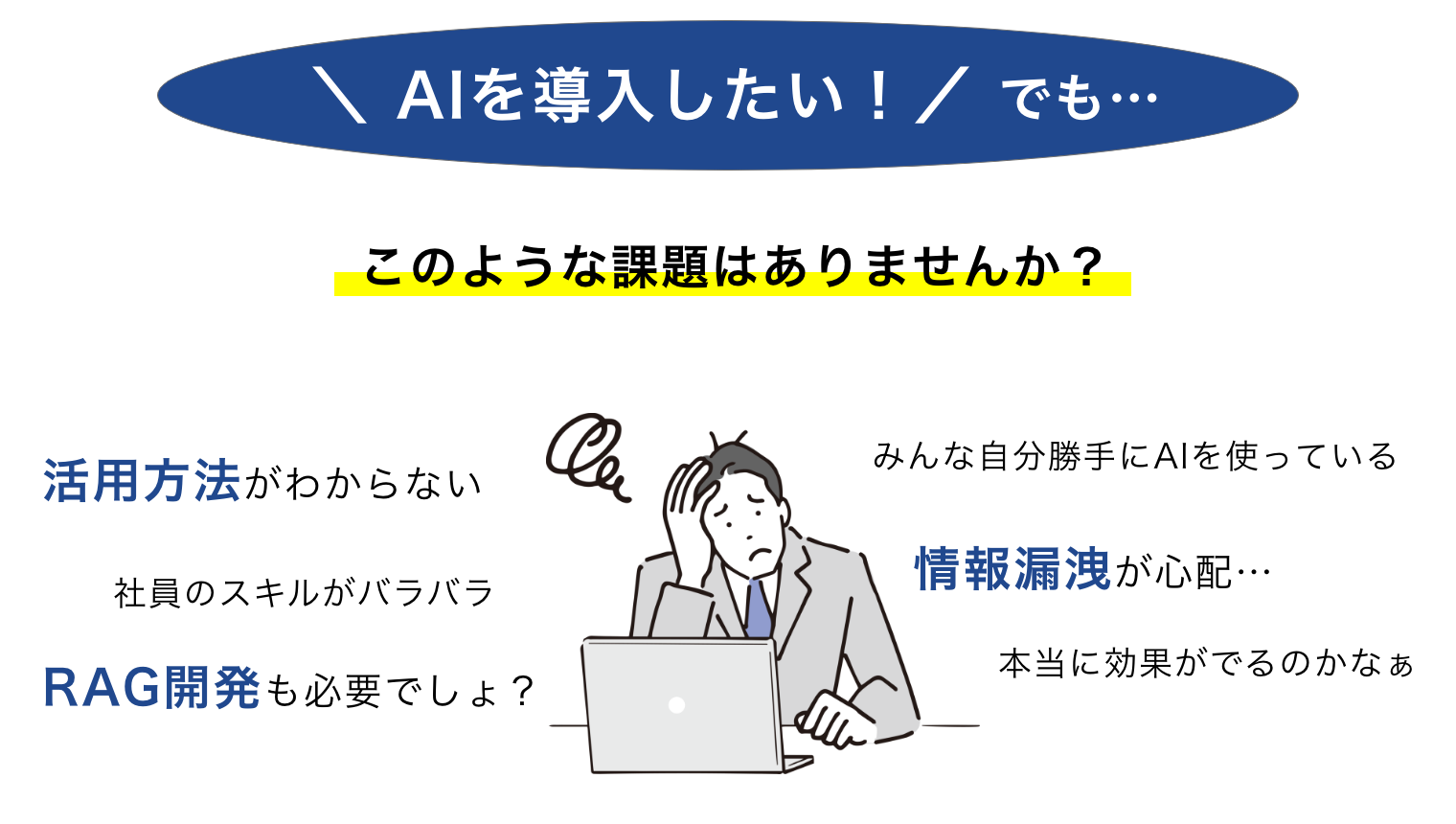 - はい。RAG有りのプランもご用意しておりますので、そちらをご利用いただけましたら、安全な業務遂行が可能です。詳細は弊社までお問合せください。